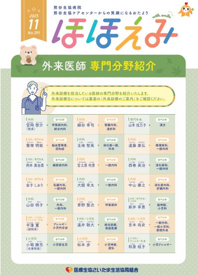 熊谷生協病院、熊谷生協ケアセンターからの笑顔になるおたより「ほほえみ」、病児保育のおたより「こぐまちゃんちだより」はこちらから閲覧できます。