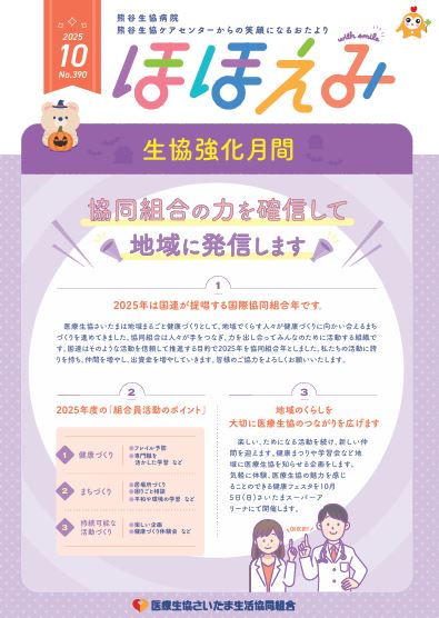 熊谷生協病院、熊谷生協ケアセンターからの笑顔になるおたより「ほほえみ」、病児保育のおたより「こぐまちゃんちだより」はこちらから閲覧できます。